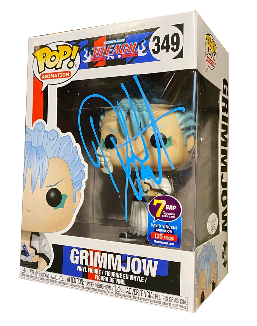 From the Bleach anime and comic series comes this Grimmjow Pop! Vinyl Figure! This is a limited edition variant of the figure that has been signed by voice actor David Vincent in blue ink and has been JSA Authenticated. Limited one of 125 pieces.