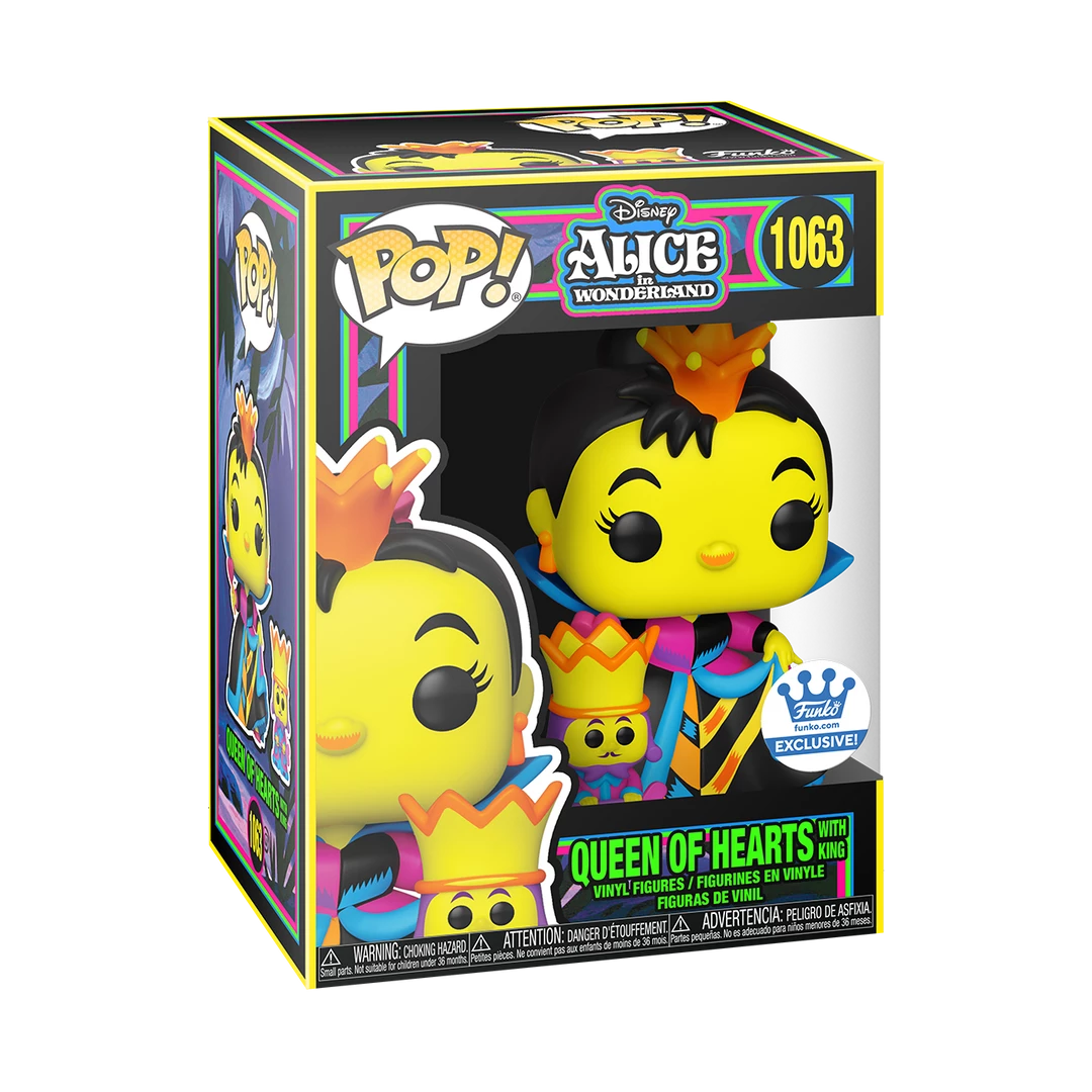 From the Disney Black Light series comes this Alice In Wonderland Queen Of Hearts with King Pop! Vinyl Figure from Funko! This is a limited edition exclusive figure.