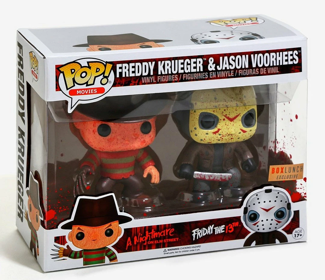 From Nightmare on Elm Street, Friday The 13th, and Freddy vs. Jason movie comes this bloody Freddy Krueger and Jason Voorhees 2-pack of Pop! Vinyl Figures from Funko! This is a limited edition, exclusive 2-pack.