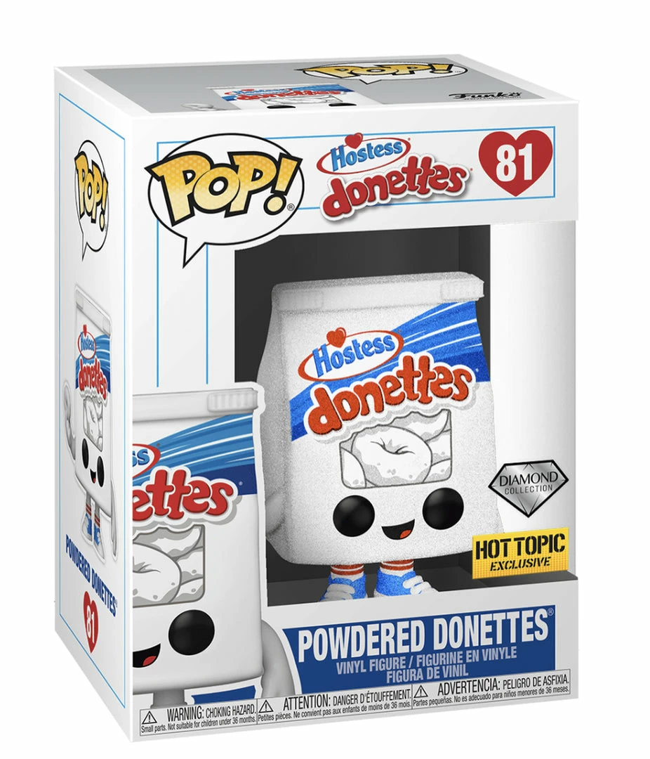 From the foodies that we love comes this Diamond Collection glitter Powdered Donettes bag in a Pop! Vinyl Figure by Funko! This is a limited edition exclusive figure.