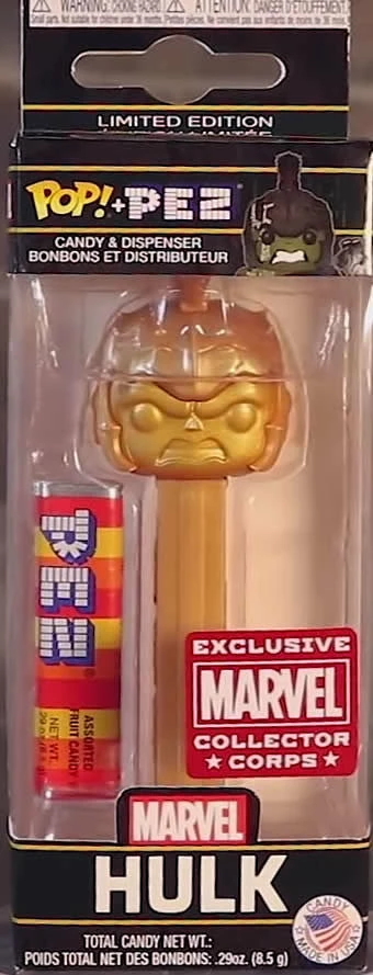 From the Marvel movieverse comes this Collector Corps exclusive gold Hulk POP! Pez from Funko! Comes with one package of Pez candy. This is a limited edition exclusive item.