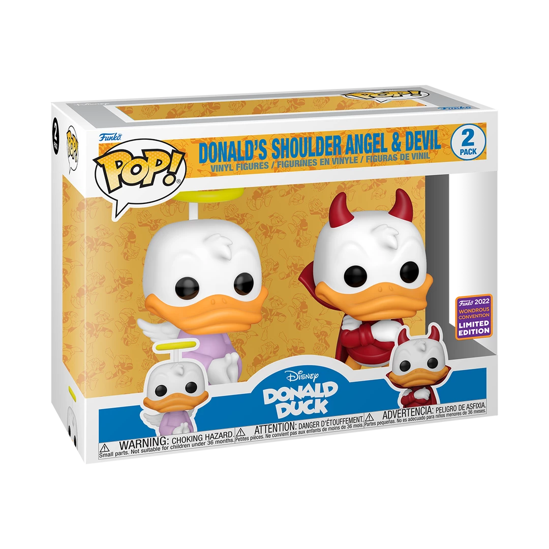 From the Disney Universe comes Donald Duck’s shoulder Angel and Devil in a Pop! Vinyl 2-pack! This is a WonderCon 2022 limited edition shared exclusive figure.Â