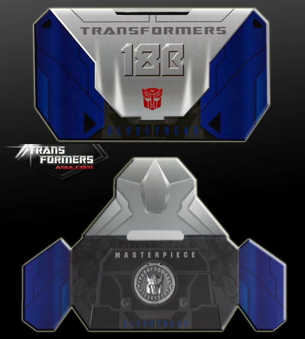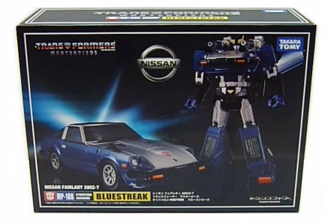 Enter Masterpiece Bluestreak! One of the most highly anticipated Masterpiece figures to date, figure includes his shoulder mounted cannon stubs, rifle and minty fresh silver and blue Datsun/Fairlady Z car alt mode we all know and love! Shoulder missiles are included in this kit, as is the Hasbro Transformers Asia Collector’s Coin.